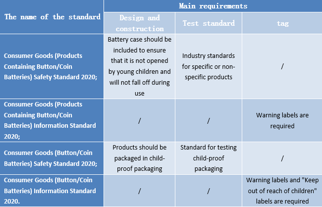 The mandatory standards will come into force from June 2022 and suppliers that export button/coin batteries and products containing button/coin batteries to Australia will have to comply with the requirements in these standards.The table below summarizes the requirements of these mandatory standards. Please contact us for details.