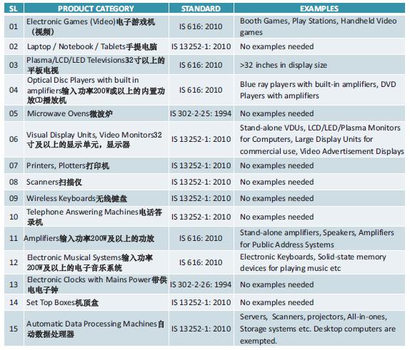 印度电子与信息技术部DeitY(Departmentof Electronics and Information Technology)发布《电子和信息技术产品(强制性注册要求)法令》。该法令规定,自2013年4月3日起,以下15类家电和信息技术产品必须在BIS认可实验室进行指定标准的测试以及注册;并在产品本身或外包装盒上标示 “自我声明-符合IS标准”的字语,才可以进入印度市场。