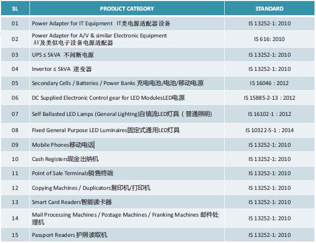 印度信息技术部(DEITY)于2014年11月7日正式发布公告:《电子与信息技术产品(强制性注册要求)法令,2012》新增15类管制产品,包括IT及AV产品用电源适配器、≤5kVA的不间断电源、移动电源、LED灯、移动电话、复印机、现金出纳机等(详细产品信息请参考下表)。